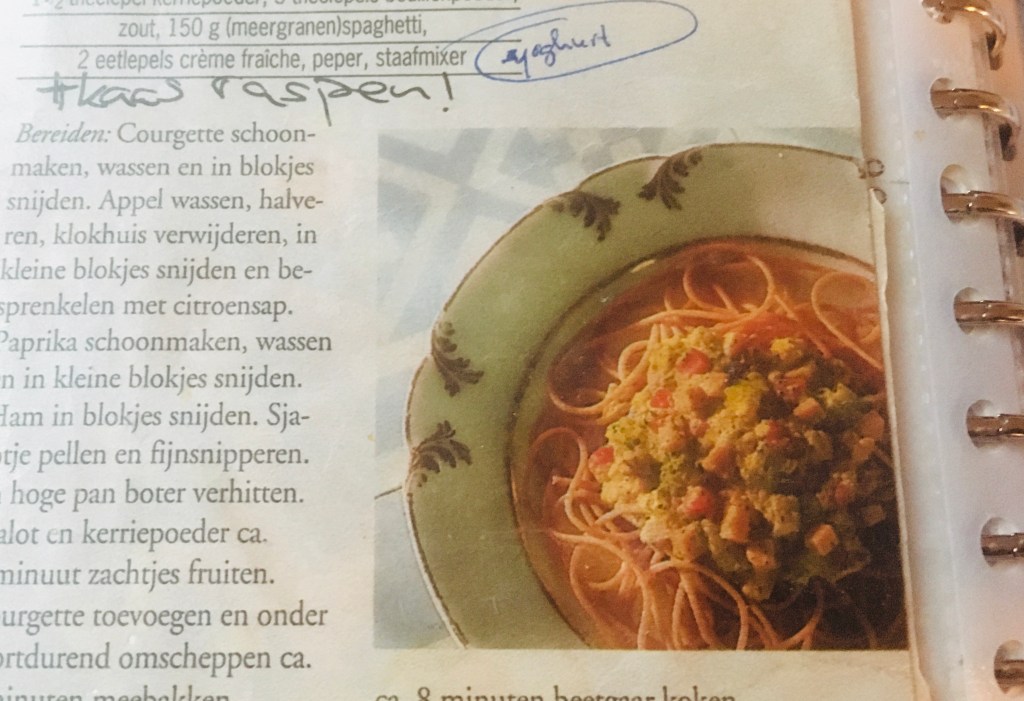 “Courgettes zijn vies”, aldus onze jongens toen ze klein waren. Zeker nadat ze de GVR hadden gelezen: de snoskommers die de GVR met lange tanden eet zijn gewoon courgettes, dat moest wel… Toch hebben we dit veel gegeten toen de kinderen klein waren, jarenlang gewoon niet verteld dat de saus gemaakt is van vooral … courgettes. Als je dit recept elders opzoekt zal het geen ‘groene saus’ heten, dat was hoe de kinderen het noemden. En waarom ”Groene saus 1”? Omdat er later ook een “Groene saus 2” bijkwam…