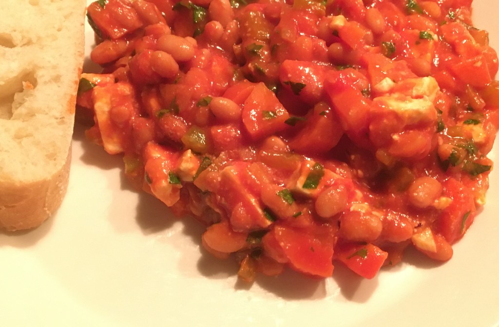 - groot blik witte bonen in tomatensaus, hoewel ik dat eigenlijk voor ons vier te weinig vind, maar 2 grote blikken is weer erg veel. Misschien zijn er ook kleinere blikken… Het ligt er ook aan hoeveel brood je erbij eet.