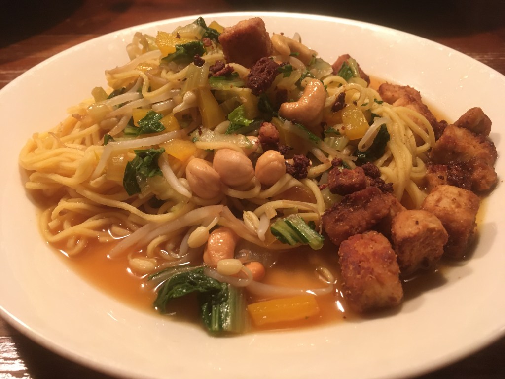 - Schep de mie en de cashewnoten erdoor.
