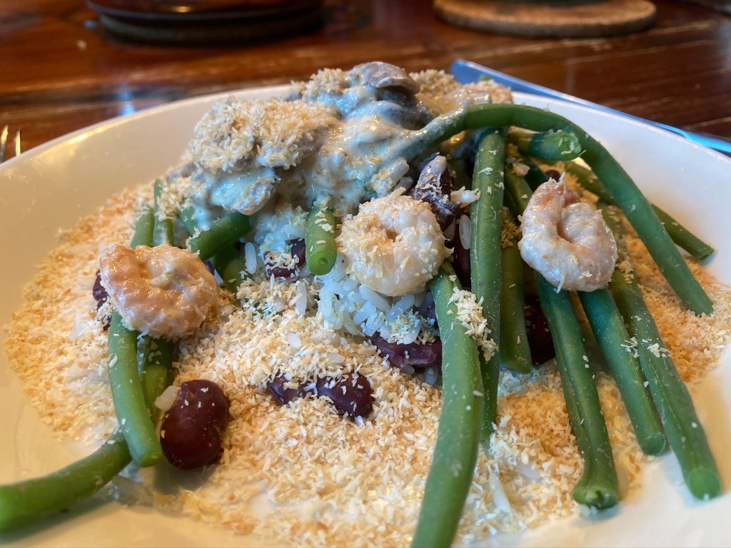 - Doe op een bord een schep rijst met bonen, daarop de champignons en garnalen met saus.
