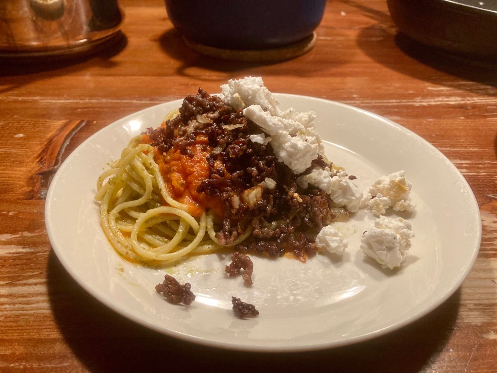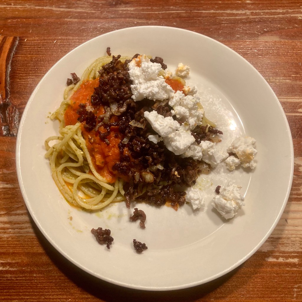 Laatst een flinke discussie met één van de kinderen over vegetarisch gehakt. Dit is zo’n recept waarvoor ik dat echt niet zou gebruiken. Ik heb tot nu toe nog nooit vegetarisch gehakt geproefd wat ik echt lekker vond. De structuur is niet goed, je kan het niet krokant bakken, in een saus wordt het wekig. Maar daar was hij het dus niet mee eens. Ik ben benieuwd of iemand me ooit iets met vegetarisch gehakt laat eten en dat ik dan niet het verschil proef…